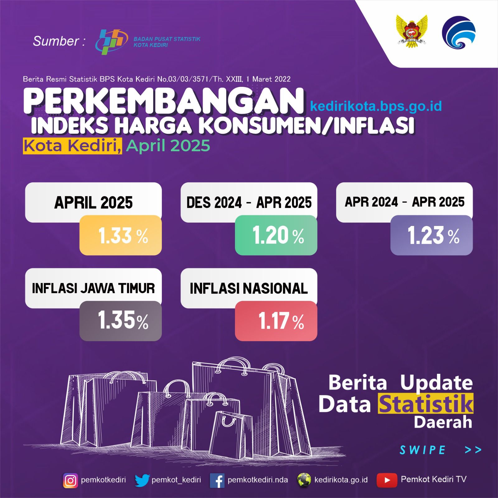Setelah hari raya Idhul Fitri berakhir, tingkat inflasi Kota Kediri Bulan April masih berada pada kondisi stabil dan terkendali. Hal itu dijelaskan Emil Wahyudiono, Kepala BPS Kota Kediri dalam Press Release Berita Resmi Statistik secara daring, Jumat (2/5). Dirinya menyebut, inflasi month-to-month (m-to-m) Kota Kediri pada bulan April sebesar 1,33 persen, inflasi year-on-year (y-on-y) sebesar 1,23 persen dan inflasi year to date (y-to-d) sebesar 1,20 persen.