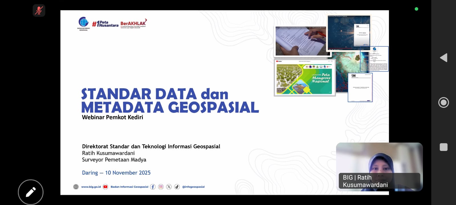 Keberadaan data geospasial yang lengkap, akurat, mutakhir, dan berstandart dapat dimanfaatkan Pemerintah Daerah dalam pengambilan keputusan yang tepat dan efisien. Maka dari itu guna meningkatkan pemahaman Aparatur Sipil Negara (ASN) dilingkungan Pemerintah Kota Kediri dalam memahami standar data dan meta data geospasial, Dinas Komunikasi dan Informatika (Diskominfo) Kota Kediri menyelenggarakan webinar melalui Zoom Meeting, Senin (10/11). Dalam webinar tersebut, materi disampaikan langsung oleh Surveyor Pemetaan Madya Badan Informasi Geospasial sebagai narasumber.