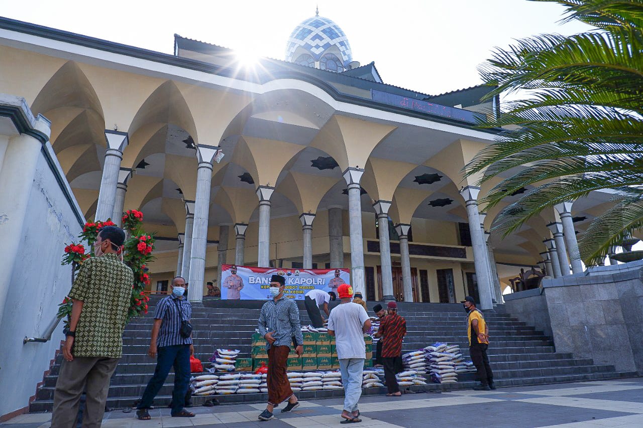Sebanyak 287 marbot masjid di Kota Kediri menerima bantuan paket sembako PPKM Darurat dari Kapolri. Berlokasi di pelataran Masjid Agung Kota Kediri, bantuan paket sembako yang berisi 5 kilogram beras, pembersih lantai, masker, handsanitizer dan vitamin diterimakan secara simbolis kepada 25 takmir masjid, Senin, (26/7).