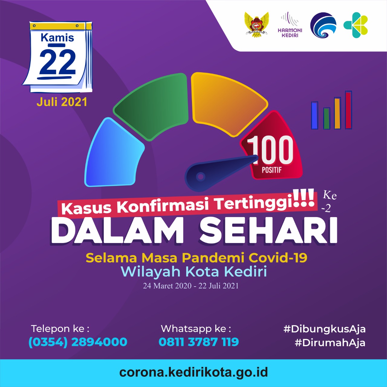 Tidak main-main, dalam satu pekan kasus terkonfirmasi positif Covid-19 di Kota Kediri terus pecah rekor. Diawali pada Selasa, (20/7) lalu sebanyak 86 kasus mencuat, dimana jumlah itu cukup tinggi sejak awal pandemi Covid-19. Pecah rekor tersebut terulang lagi kemarin, Kamis, (22/7), sebanyak 100 orang dinyatakan positif.