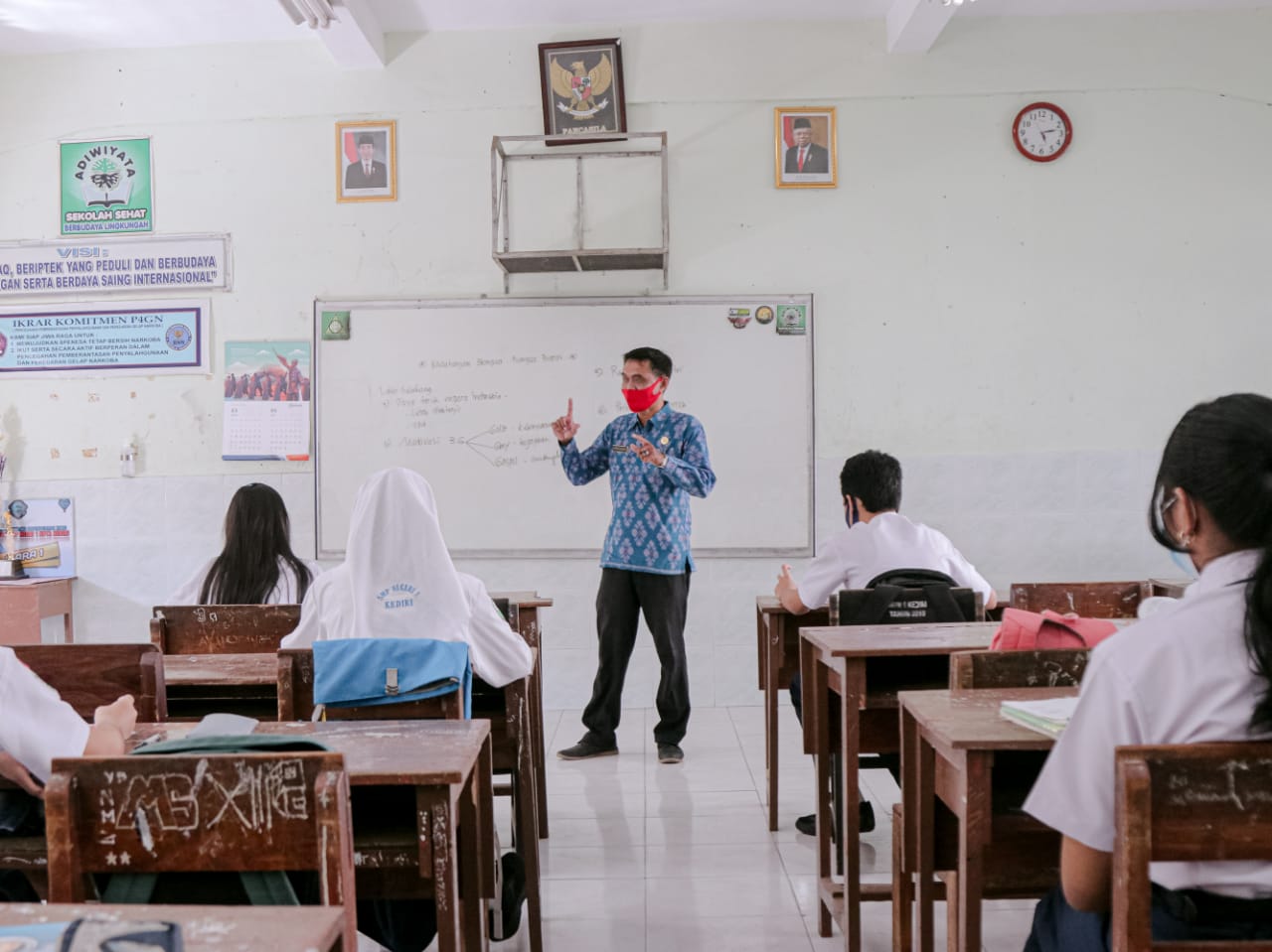 Pelaksanaan uji coba sekolah tatap muka sejak Senin (26/4/2021) telah berjalan. Diperlukan kerja ekstra guna memastikan pembelajaran dapat berjalan dengan lancar sesuai dengan protokol kesehatan Covid-19. Seperti Selasa (27/4/2021), SMP Negeri 1, sebagai salah satu sekolah yang ditunjuk untuk melaksanakan uji coba tatap muka, memastikan bahwa penerapan protokol kesehatan berjalan tertib.