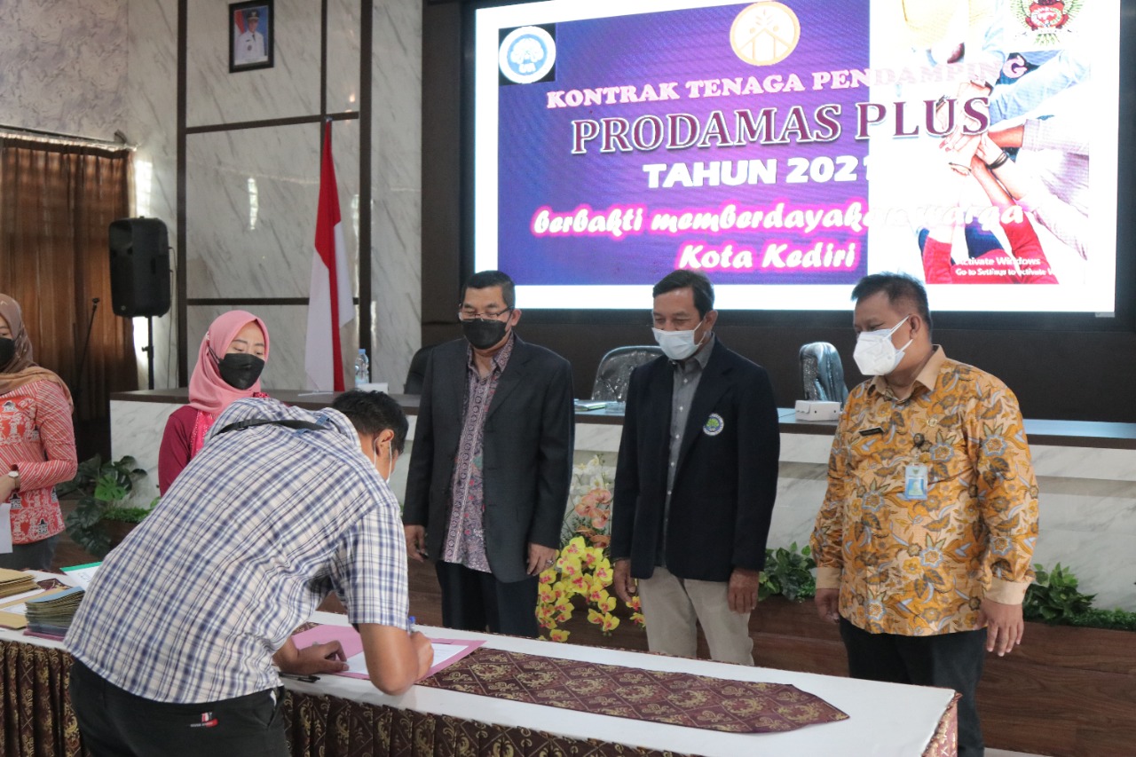 Selasa, (29/6) sebanyak total 64 tenaga pendamping Prodamas plus tanda-tangani kontrak perjanjian kerja dengan LP2M Universitas Negeri Malang, hasil kerja sama dengan Pemerintah Kota Kediri melalui Bagian Pemerintahan. Penandatanganan tersebut dilakukan di balai pertemuan Badan Kepegawaian, Pendidikan, dan Pelatihan (BKPPD) Kota Kediri.