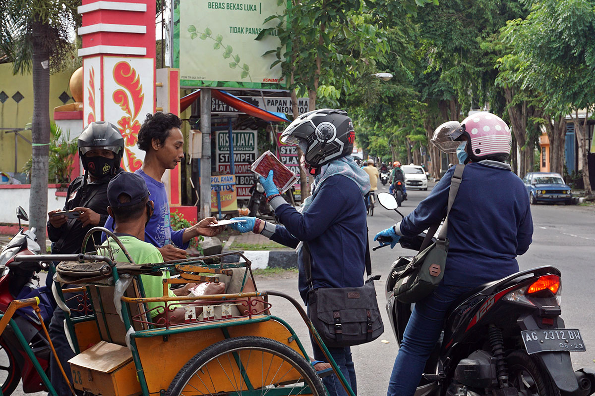 “Kami melihat para tukang becak itu kerap kali mengenakan masker yang harus sekali pakai, tapi dipakai berhari-hari. Kami juga melihat masker kain hanya punya satu, jadi kami bagikan supaya mereka bisa ganti-ganti,” kata Triyono Kutut, Kepala Dinas Sosial Kota Kediri. Pembagian dilakukan oleh Dinsos, Tagana(Taruna Siaga Bencana), TRC (Tim Reaksi Cepat), TKSK (Tenaga Kesejahteraan Sosial Kecamatan), dan Pekerja Sosial.