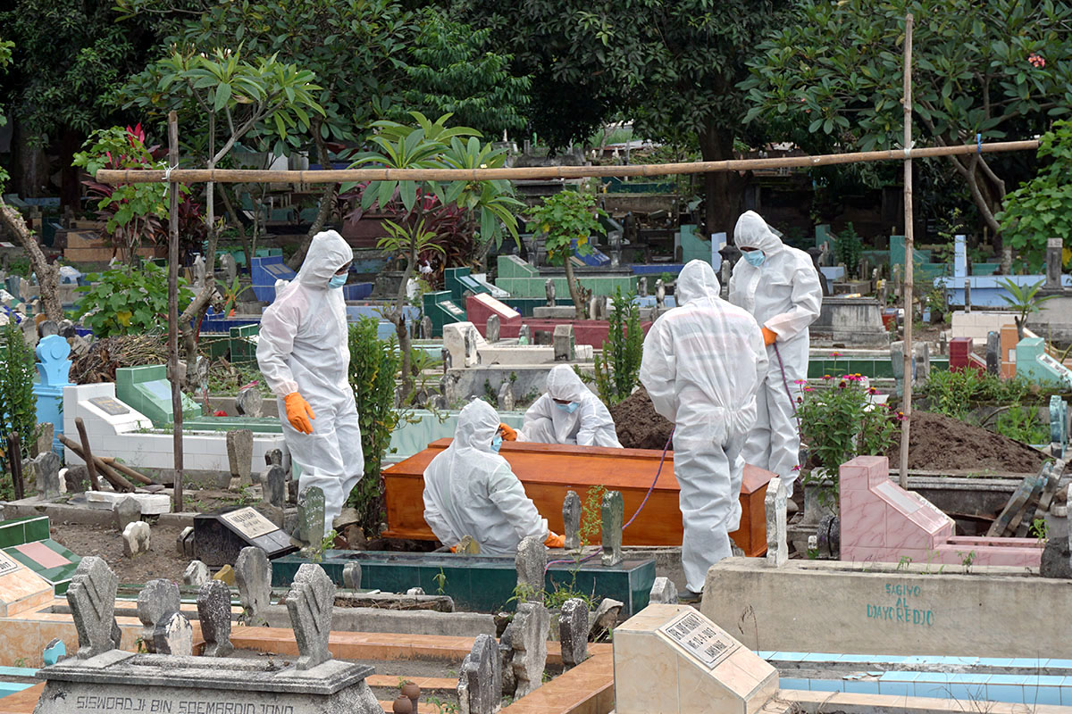 “Kami direkrut sejak awal pandemi. Dulu, tidak ada yang mau karena takut. Siapa yang tidak takut? Baju pun masih pakai jas hujan, APD masih langka,” kata Suhartono, petugas pemakaman, 5/01/2021. Suhartono tidak menghitung dengan pasti, berapa jumlah jenazah yang mereka makamkan.