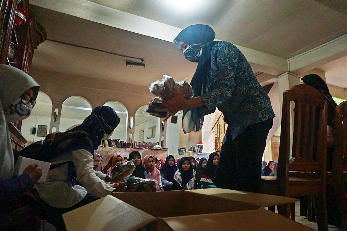 Penyerahan dilakukan usai Sholat Dhuhur. Sejumlah 4.000 lembar masker yang dikemas dalam 4 boks diterima langsung oleh Hj. Azzah Noor Laila, pengasuh Ponpes HMQ disaksikan oleh beberapa santri putri. Setelah dibuka, secara simbolis beberapa santri putri praktik ...