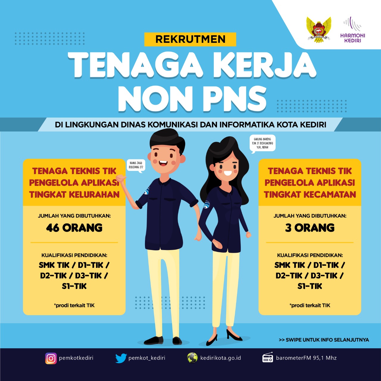 ...Dalam rangka meningkatkan kinerja Pemerintah Kota Kediri khususunya Dinas Komunikasi dan Informatika mengundang putra dan putri terbaik Kota Kediri dan sekitarnya untuk bergabung bersama kami sebagai Tenaga Teknis TIK (Operator TIK Tk. Kelurahan dan Tk. Kecamatan)